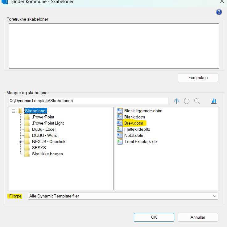 - Vælg den skabelontype, du ønsker fx Word (højre vindue) og "Brev"