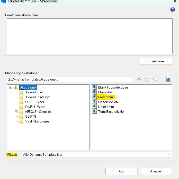 - Vælg den skabelontype, du ønsker fx Word (højre vindue) og "Brev"